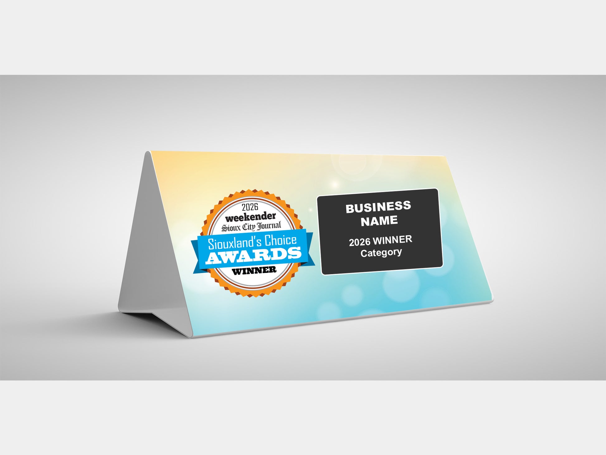 6”tall x 12” length 100 pound card stock. Folds to stand on a counter or table top.